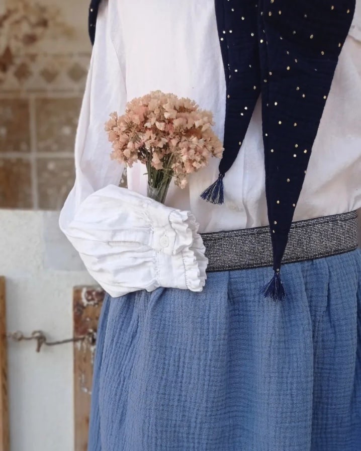 J’ai choisi de réaliser mes créations principalement en gaze de coton Oeko-tex certifié sans traitement chimique. J’utilise aussi le Coton bio Alimentaire, le Nid d’abeille, le lin. Les tissus sont sélectionnés avec soin, lavés avant chaque création, les découpes sont utilisées pour réaliser des accessoires ; l’ upcycling fait parti des valeurs auxquelles je contribue -> rien ne se perd tout se transforme !