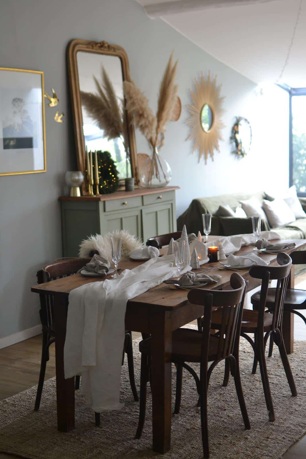 Chemin de table – Eucalyptus clair pois dorés 65X245